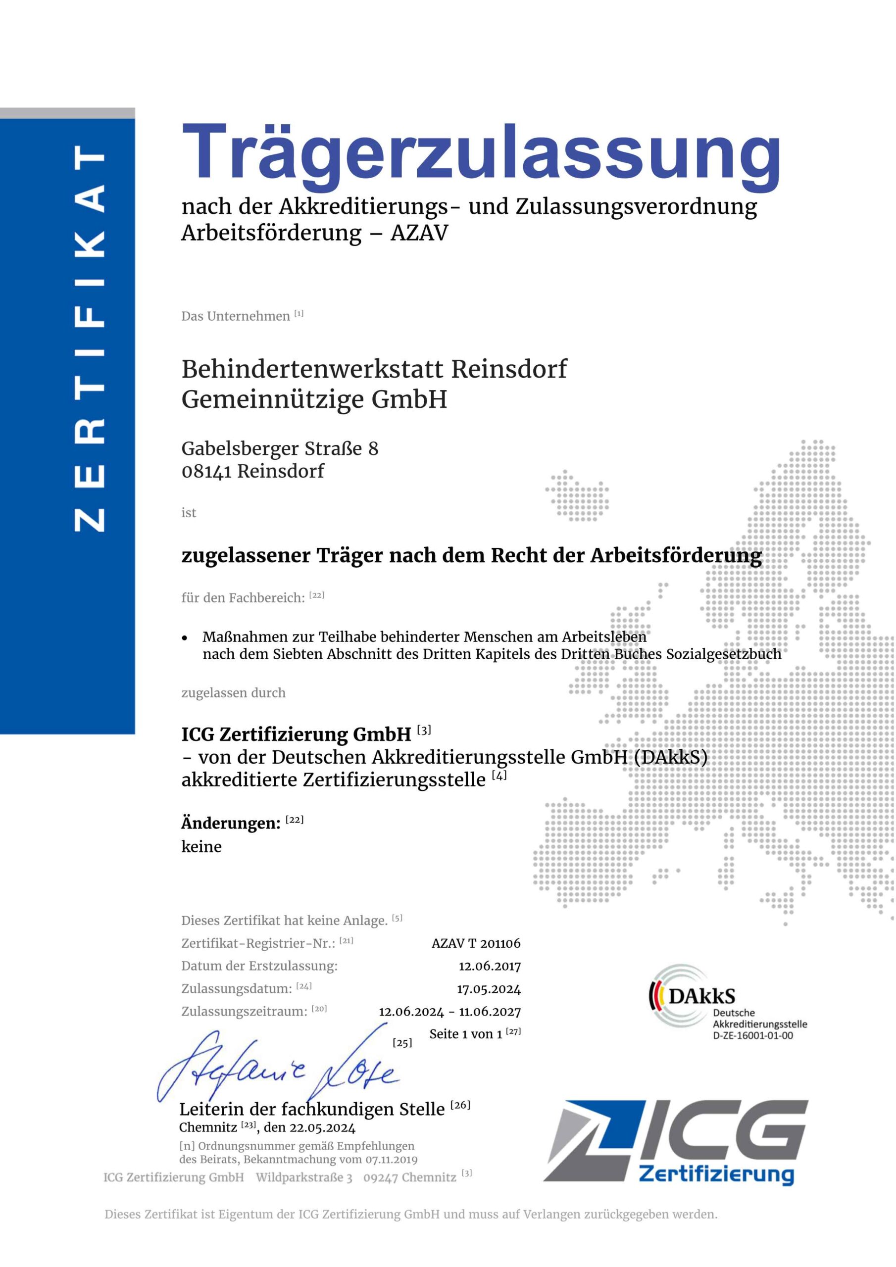 Trägerzulassung nach AZAV für das Unternehmen Behindertenwerkstatt Reinsdorf gGmbH im Fachbereich 6
